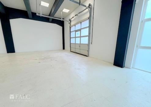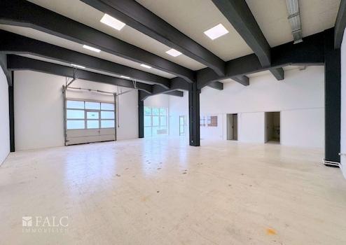 Die Lagerhalle beeindruckt mit einer großzügigen Deckenhöhe, die vielfältige Lagermöglichkeiten oder das Aufstellen großer Maschinen erlaubt. Ein nach oben öffnendes Tor erleichtert nicht nur den Zugang, sondern maximieren auch den Raum in der Halle. Die strategische Platzierung erlaubt einen bequemen Zugang für Sattelschlepper, ohne aufwendiges Rangieren.