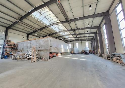 Die miteinander verbundenen Produktionshallen sind durch besonders große Sektionaltore befahrbar. Hallenhöhen bis zu ca. 10,5 Meter und schwer belastbare Böden bieten beste Voraussetzungen für Ihren Betrieb.