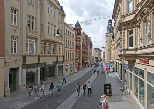 Hier gehen die Saalestädter einkaufen. Die Leipziger Straße ist der Boulevard der Stadt Halle und dient als die wichtigste Fußgängerverbindung zwischen dem Hauptbahnhof und dem Marktplatz. Hier kommt niemand an Ihnen vorbei!