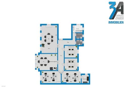 Die Fläche umfasst sechs große Büroräume, welche dank der hohen Decken und der großen Fensterfront mit viel Tageslicht durchflutet werden. Zusätzlich gibt es eine voll ausgestattete Einbauküche, die Ihren Mitarbeitern Komfort und Flexibilität bietet, sowie zwei separate Toiletten für maximale Praktikabilität. Im Keller stehen Ihnen zwei weitere Büroräume zur Verfügung – perfekt als Archiv, Lager oder Besprechungsraum nutzbar.