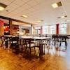 Der Saal ist mittels einer Schiebetür bei Bedarf räumlich trennbar.