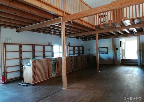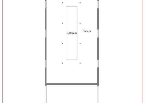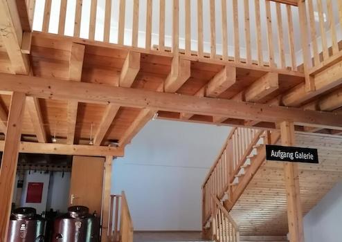 Eine aus einer Holzkonstruktion gebaute Galerie (im ursprünglichen Bauplan wurde hier eine ca. 60 qm große Wohnung vorgesehen), bildet eine zweite Ebene, die ebenfalls vielseitig genutzt aber auch entfernt werden kann.