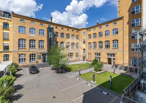 Das Bürogebäude in der Haferkornstraße 7, 04129 Leipzig, zeichnet sich durch seine beeindruckende Architektur im industriellen Backsteinstil aus. Die Fassade, die aus einer harmonischen Kombination von gelben und roten Backsteinen besteht, verleiht dem Gebäude einen einzigartigen, historischen Charme. Im Innenhof finden Sie einen gepflegten Grünbereich, der eine angenehme Atmosphäre schafft und ausreichend Platz für Fahrräder sowie gemütliche Sitzgelegenheiten bietet. Das Gebäude erstreckt sich über mehrere Etagen und ist mit modernen Annehmlichkeiten ausgestattet, darunter ein Glasaufzug und eine Außentreppe, die auch als Fluchtweg dient. Die ruhige Umgebung ist gut erschlossen und bietet zahlreiche Parkmöglichkeiten entlang der Straße. Die gelungene Kombination aus historischen Elementen und modernen Details sorgt für eine angenehme Arbeitsumgebung in einem charmanten industriellen Setting.