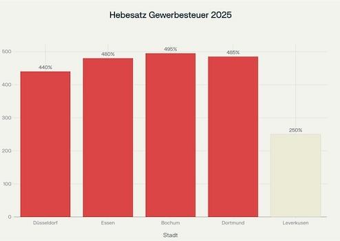 Ein Unternehmen mit einem Jahresgewinn von 1.000.000 € zahlt bei einem Hebesatz von 500 % (typisch im Ruhrgebiet) rund 170.000 € Gewerbesteuer. In Leverkusen wären es bei gleichem Gewinn nur 87.500 € – das entspricht einer Ersparnis von 85.000 € pro Jahr.