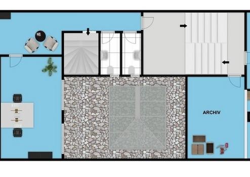 Im 1. Obergeschoss erwarten Sie eine offene Arbeitsfläche, sowie ein separates Büro. sowie Zusätzlich stehen Lager- und Archivräume sowie getrennte Sanitäreinheiten zur Verfügung.