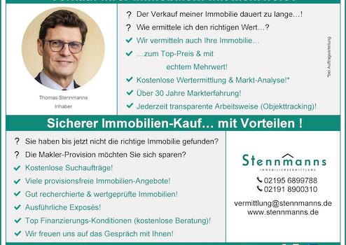 Sie möchten gerne Ihre Immobilie verkaufen, die Vermarktung aber nicht selbst abwickeln, sondern einen Profi-Makler mit der Vermittlung beauftragen? Dann würden wir uns über Ihre Kontaktaufnahme unter 02195-6899788 oder unter vermittlung@stennmanns.de sehr freuen. Im unverbindlichen Erstgespräch zeigen wir Ihnen gerne den Mehrwert und Ihre Vorteile auf, die Sie mit der Beauftragung von Stennmanns Immobilienvermittlung erhalten.