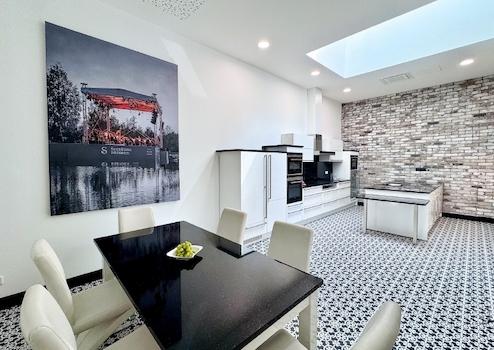 Die großzügige Raumstruktur, geprägt von sichtbaren Backsteinwänden und einer beeindruckenden Deckenhöhe von vier Metern, sorgt für eine offene und einladende Atmosphäre.