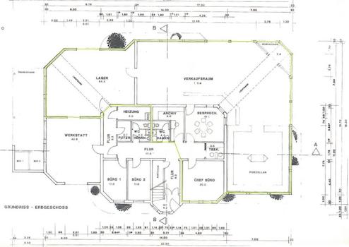Aufteilung: Verkaufsraum, 2 Büros, Teeküche, WC, Archiv, Garage