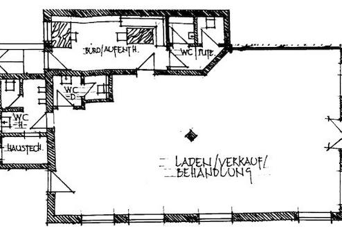 die Fläche sehr hell. Die beiden Kunden-WCs sind hell gefliest. Der ebenfalls geflieste Aufenthaltsraum ist sowohl vom Hinterhof als auch von der Ladenfläche aus begehbar. Er ist mit einer Küchenzeile und Sitzmöglichkeit ausgestattet. Nebenan befinden sich das Personal-WC mit Vorraum sowie die Putzkammer, jeweils mit Fliesenboden. Eine Deckengrundbeleuchtung ist vorhanden.