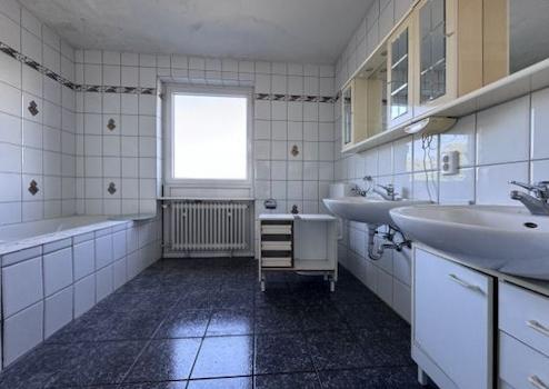 mit Wanne, Dusche und zwei Waschbecken ausgestattet. Das separate WC ist ebenfalls gefliest.