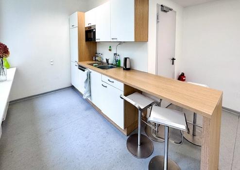 Für den täglichen Komfort steht eine moderne Einbauküche zur Verfügung, die direkten Zugang zu einer kleinen Außenterrasse bietet – ideal für Pausen im Freien.
