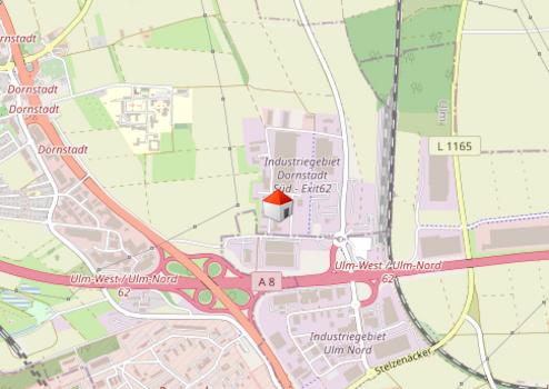 Die Liegenschaft befindet sich im etablierten Gewerbegebiet von Dornstadt im Alb Donau Kreis, nur rund 10 Kilometer nördlich von Ulm. Der Standort ist verkehrstechnisch hervorragend angebunden. Die Autobahn A8 in Richtung Stuttgart und München ist in weniger als fünf Minuten über die Anschlussstelle Dornstadt erreichbar. Über das nahegelegene Autobahnkreuz Ulm Elchingen ist zudem die A7 schnell zugänglich. Dies ermöglicht effiziente Verbindungen in Nord Süd Richtung, etwa nach Würzburg oder Kempten.