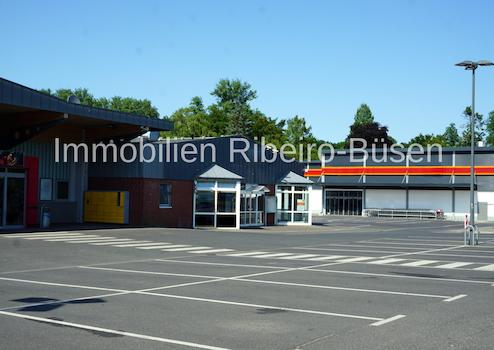 Der Eingang der hier angebotenen Einheit liegt nahezu mittig in einer U-förmigen Gebäudeformation, bestehend aus einem Vollsortimenter (REWE), einem Discounter (NORMA), einem Discounter-Kaufhaus (Woolworth) und einem Imbiss: Eine gute Sichtbarkeit ist daher gewährleistet.