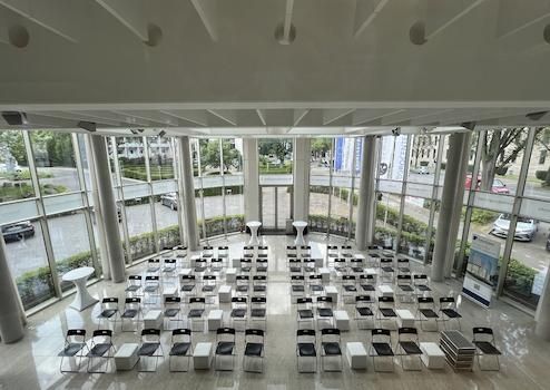 - einen zweigeschossigen elliptischen Glasanbau als Forum für Empfänge und Veranstaltungen aller Art für bis zu 250 Personen