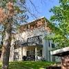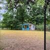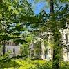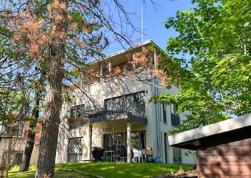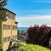 Dieses mit Bäumen bewachsene Baugrundstück ist auf zwei Seiten von Villen und Mehrfamilienhäusern umgeben, auf zwei von Wald und Wiese.