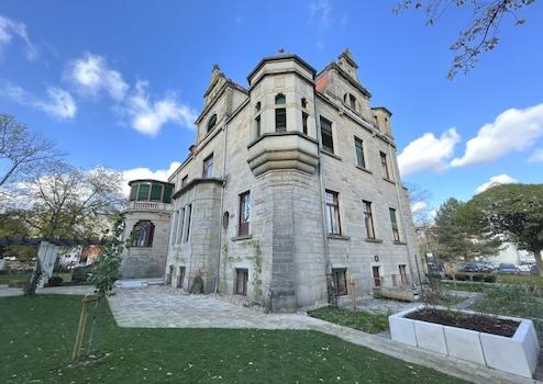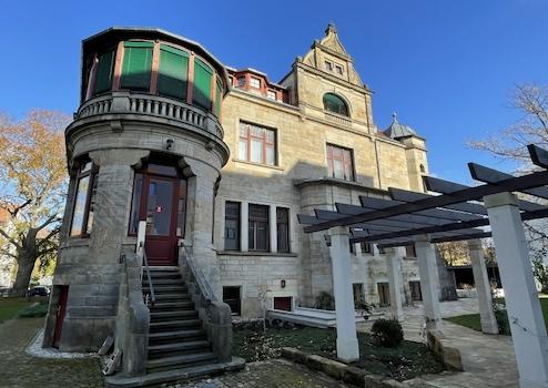 Die Fassade der Villa wird von eindrucksvollen Ornamenten geziert. Auch im Inneren imponiert das Gebäude mit original erhaltenen Holzdecken und Intarsienarbeiten.