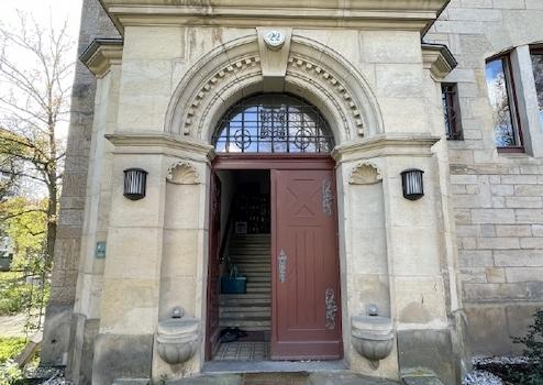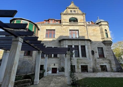 Die Fassade der Villa wird von eindrucksvollen Ornamenten geziert. Auch im Inneren imponiert das Gebäude mit original erhaltenen Holzdecken und Intarsienarbeiten.