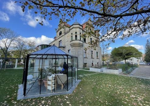 Der parkähnliche Garten lädt zu entspannten Pausen ein. Für etwas kältere Tage kann im verglasten Teehaus oder Wintergarten verweilt werden.