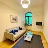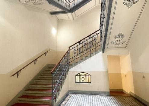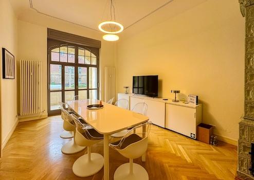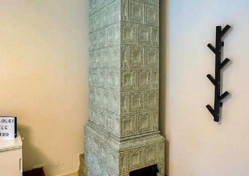 Neben zwei Balkonen, Stuckdecken und Flügeltüren ist ein besonderes Highlight ein historischer Kachelofen.