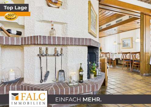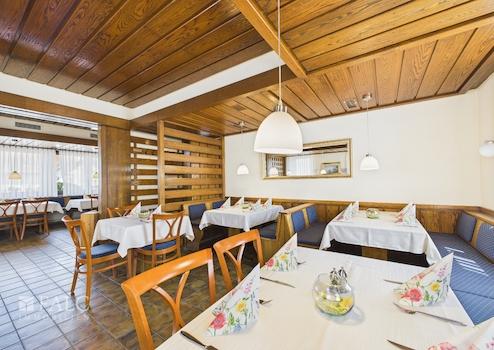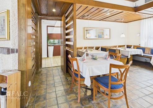 Ein besonderes Highlight ist der lichtdurchflutete Wintergarten, der mit dem angrenzenden Außenbereich hinter dem Haus verbunden ist. Diese Erweiterung des Gastronomiebereichs schafft Raum für zahlreiche Gäste und bietet die ideale Kulisse für sommerliche Abende, gesellige Feiern oder stilvolle Veranstaltungen unter freiem Himmel. Für zusätzlichen Komfort sorgen die modernen Gäste-WCs im Restaurantbereich.