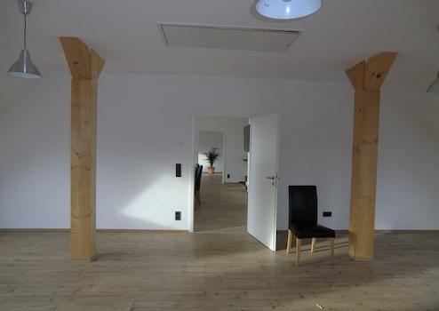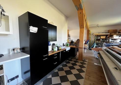 Die Ausstattung umfasst zwei Einbauküchen, die ideal für die Bedürfnisse eines modernen Gewerbebetriebs ist. Zuletzt wurde die Scheune für die Erstellung von Werbefolien genutzt. Ein zusätzlicher Abstellraum bietet ausreichend Platz für Lagerungen und die moderne Erdwärmepumpe.