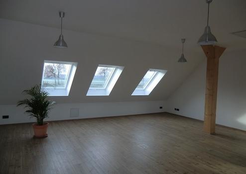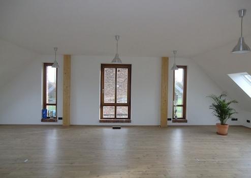 Der Fußboden ist mit pflegeleichtem, aber hochwertigem Laminat ausgelegt, und die Fenster bestehen aus langlebigem Kunststoff mit Funktionsglas. Im Erdgeschoss bestehen die Fensterrahmen aus Holz, die mit etwas Liebe wieder in neuem Glanz strahlen werden. Außerdem verfügt das Objekt über 19 hochwertige VELUX Dachfenster aus Kunststoff mit elektronischen Dachfensterrollläden.