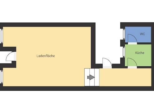 Der Laden besitzt neben der Verkaufsfläche zwei kleine separate Räume für die Küche und die Toilette. Lieferanten können den Seiteneingang über den Hof nehmen. Die gut erhaltene Holzbalkendecke und die historischen Sandsteinelemente verleihen dem Raum ein besonders charmantes Ambiente. Links und rechts vom Eingang befinden sich zwei große Schaufenster über die gesamte Ladenbreite. Über den Eingangsbereich vor der Straßenseite befindet sich eine großflächige, ausfahrbare Markise. Durch ihre Position entlang der gesamten Front sorgt sie für ein einladendes Erscheinungsbild und schützt gleichzeitig Besucher vor Regen und Sonne.