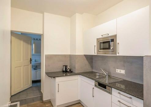 Die Küche verfügt über eine Einbauküche mit Spülmaschine, Edelstahlspüle, Mikrowelle sowie Ober- und Unterschränken.