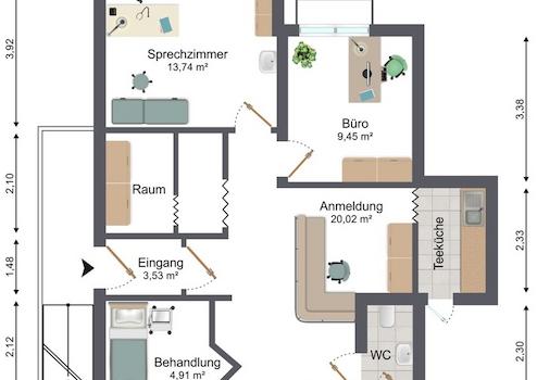 Die Fläche von ca. 75m² ist praktisch in zahlreiche kleine Räume aufgeteilt: Windfang, Empfang, Teeküche, Wartebereich, 3 Behandlungskabinen (4m², 5m² und 6m²), zwei Büroräume (9,5m² und 13,7m²), WC + Abstellraum.
