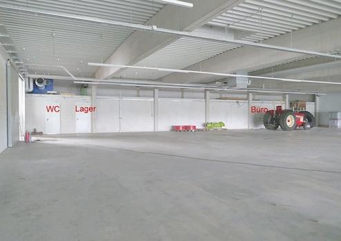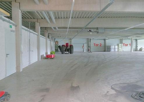 Die Halle 2 verfügt ebenfalls über ca. 585 m² reine Lager- und Produktionsfläche mit einer Höhe von ca. 3,5 m UK-Träger. Auch hier erfolgt die Andienung über 1 Verladetor mit elektrischem Rolltor ( B. 4 m x H. 3, 26 m). Zusätzlich gehören zur Mietfläche noch ein ca. 80 m² großer Büroraum und ca. 8 m² sanitäre Anlagen.