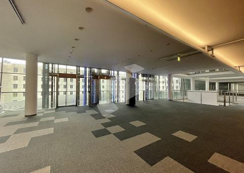 Neben der Rezeption und der Empfangslounge beheimatet der zentrale Eingangspavillon in Zukunft auf den verschiedenen Ebenen alle Bereiche, die den Arbeitstag komfortabel ergänzen: einen Event Space, Gastronomie und Barista-Flächen, einen hauseigenen Kindergarten sowie eine Paketstation. Im hinteren Teil des Erdgeschosses öffnet sich der Pavillon zu einem großzügigen Innenhof, der mit Pflanzen und Wasserflächen zum grünen Erhol-Moment oder zum Raum für Outdoor-Meetings wird.