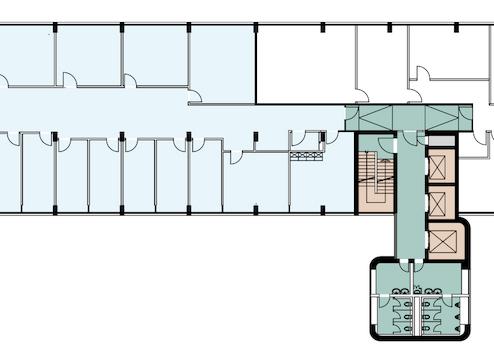 Das 8-geschossige Hochhaus in verkehrstechnisch günstiger Lage wurde komplett umgebaut und modernisiert. Der neue eingangsbereich im Service-Turm des Gebäudes setzt mit seiner raumhoch verglasten Lobby starke Akzente. Auch der Vorraum der Personenaufzüge folgt dem Konzept des gesamten OrangeOffice - einfach einladend.