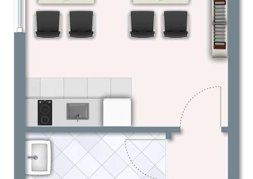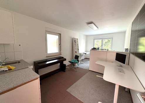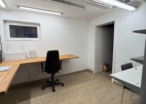 Im benachbarten Gebäude befindet sich eine weitere Einheit mit einem separaten WC, das mit einem Waschbecken und einem Pissoir ausgestattet ist. Geht man weiter geradeaus, gelangt man in einen großzügigen Raum, der flexibel als Büro, Aufenthalts- oder Pausenraum genutzt werden kann. Eine eingebaute kleine Küche schafft hier zusätzliche Aufenthaltsqualität und bietet sich ideal für Personal- oder Besprechungszwecke an.