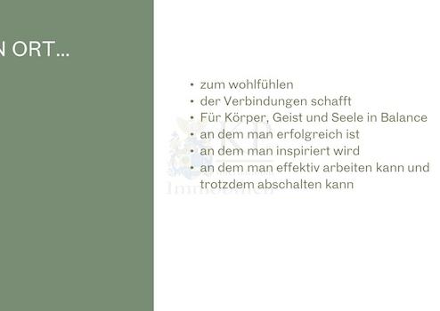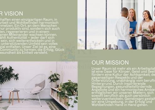 Wir schaffen einen einzigartigen Raum, in dem Arbeit und Wohlbefinden harmonisch verschmelzen. Ein Ort, an dem Menschen nicht nur produktiv sind, sondern sich auch entfalten, regenerieren und in einem achtsamen Miteinander wachsen können. Hier zählt Authentizität - jeder darf sich selbst sein, sich weiterentwickeln und in einem unterstützenden Umfeld sein volles Potenzial entfalten. Unser Ziel ist es, eine Büro-Community zu formen, die Erfolg, Glück und Gesundheit als Einheit versteht.