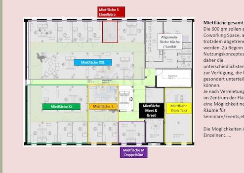 Die 600 qm sollen als Coworking Space, aber trotzdem abgetrennt genutzt werden. Zu Beginn des Nutzungskonzeptes stehen daher die unterschiedlichsten Flächen zur Verfügung, die bei Bedarf gesondert unterteilt werden können.