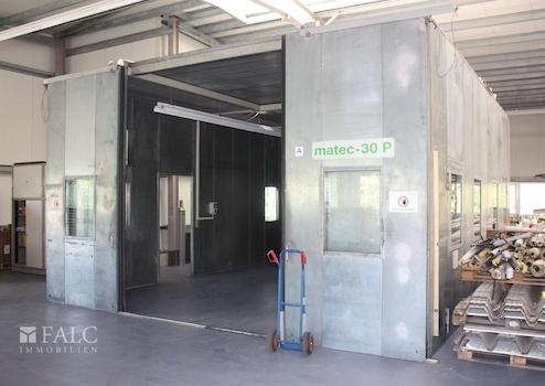 Im Inneren der beheizbaren Halle finden sich helle, offene Flächen, die durch große Fensterfronten viel Tageslicht bieten. Ein integrierter Schweißraum ermöglicht spezialisierte Arbeiten direkt vor Ort. Die Büroflächen sind funktional gestaltet und bieten Raum für administrative Tätigkeiten.