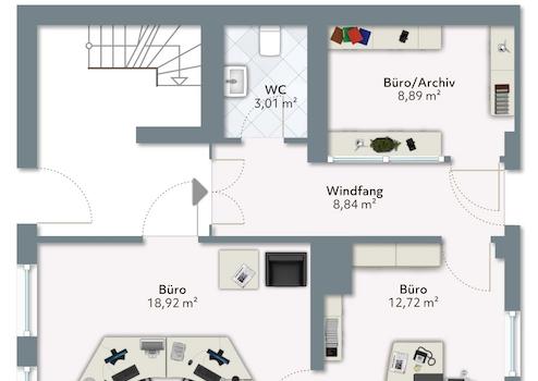 Ein effektiver Grundriss mit 2 homogen geschnittenen Räumen bieten diverse Gestaltungsmöglichkeiten. Der 3. Raum ist gut als Archiv oder Abstellfläche zu nutzen.