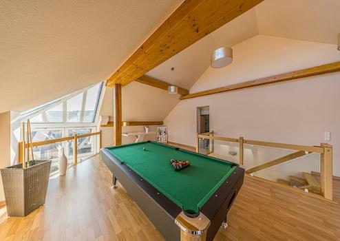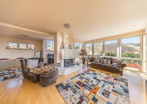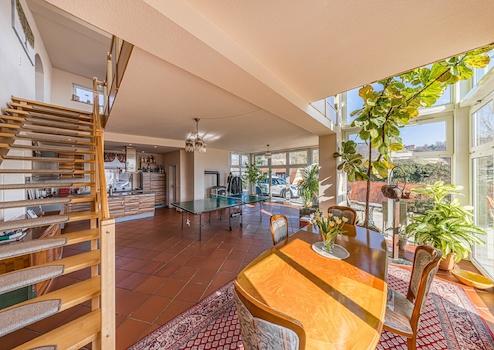 Große Fensterfronten, ein heller Wintergarten und mehrere Rückzugsorte im Freien – darunter eine sonnige Terrasse, ein Balkon mit Aussicht und ein gepflegter Außenpool – unterstreichen den hohen Freizeitwert dieser besonderen Immobilie. Der teilunterkellerte Bau ist mit einer Gaszentralheizung ausgestattet; zusätzlich sorgen ein Kamin im Obergeschoss sowie ein Ofen im Erdgeschoss für behagliche Wärme an kühleren Tagen.