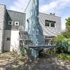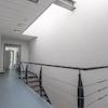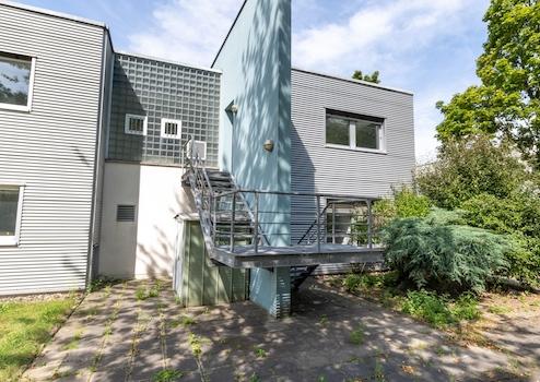 Der vordere Hauptzugang ist stufenlos erreichbar, ein weiterer Zugang ins Obergeschoss erfolgt über ein rückseitiges, außenliegendes Treppenhaus, das gleichzeitig als zweiter Rettungsweg dient.