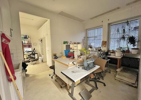Der barrierefreie Zugang über den Haupteingang macht das Objekt besonders nutzerfreundlich. Die Einheit bietet ein vielfältiges Raumangebot: einen Lagerraum, einen Aufenthaltsraum mit Teeküche, ein Büro, zwei Anproberäume, zwei WCs und drei Werkstattbereiche. Letztere verfügen über die notwendigen technischen Anschlüsse wie Wasser, Starkstrom und Druckluft, die den Betrieb von Spezialgeräten ermöglichen.