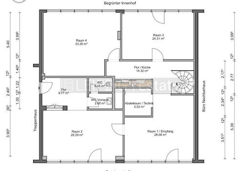 Die Gesamtfläche beträgt ca. 180 m². Davon entfallen ca. 150 m² auf die Büro-/Praxisfläche und weitere ca. 30 m² auf Nebenfläche.