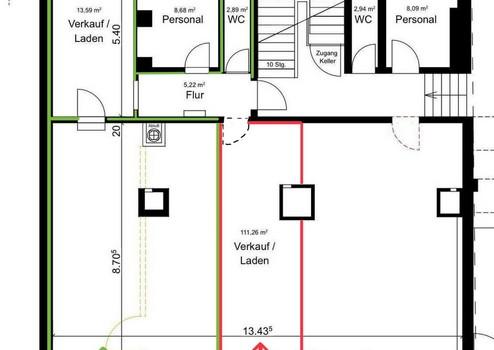 1: Grün eingezeichnete Fläche mit ca. 76m2 plus ca. 26m2 Lagerfläche in zwei Kellerabteilen für €7.800 pro Monat. Eine Schaufenstertüre und zweites Schaufenster an der Front.