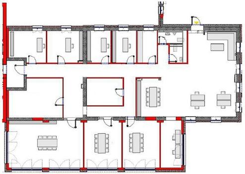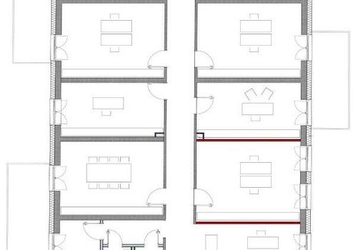 Im 1. Obergeschoss mit Lift befinden sich helle Büroflächen. Sie sind überwiegend mit Nadelfilzboden ausgelegt. Die Teeküchen sind mit Küchenanschlüssen und die WCs sind gefliest. Vom Flur aus sind nahezu alle Räume erreichbar. Die Fenster sind mit elektrischen Raffstores ausgestattet. Die EDV-Verkabelung verläuft in der Wand. Viele Büroräume des Neubaus haben Zugang zu den großen Balkonen.