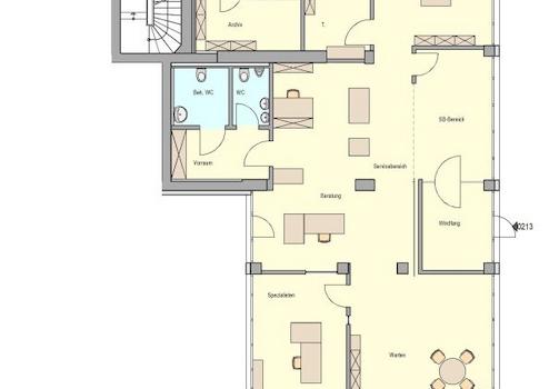 Die klimatisierte Fläche im Erdgeschoss ist variabel gestaltbar. Ein Umbau durch den Eigentümer ist Verhandlungssache. Derzeit sind von der Großraumfläche mehrere Büros abgetrennt. Die WC-Anlage ist modern gefliest und besteht aus einem Vorraum und zwei WCs, eines davon behindertengerecht. Im Sozialraum befindet sich eine Einbauküche. Sie ist mit Ceranfeld, Kühlschrank, Geschirrspüler und Mikrowelle ausgestattet. Die sich über alle Seiten erstreckende Fensterfront bietet beste Werbe- und Präsentationsmöglichkeiten. Es sind überwiegend Teppichböden verlegt. Die EDV-Verkabelung verläuft teilweise in Bodentanks und Unterputz. In der abgehängten Decke sind Leuchten integriert.