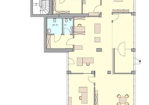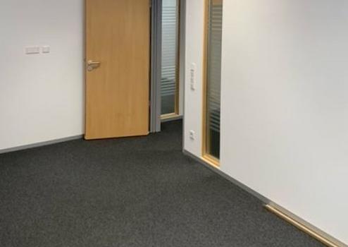 Die klimatisierte Fläche im Erdgeschoss ist variabel gestaltbar. Ein Umbau durch den Eigentümer ist Verhandlungssache. Derzeit sind von der Großraumfläche mehrere Büros abgetrennt. Die WC-Anlage ist modern gefliest und besteht aus einem Vorraum und zwei WCs, eines davon behindertengerecht. Im Sozialraum befindet sich eine Einbauküche. Sie ist mit Ceranfeld, Kühlschrank, Geschirrspüler und Mikrowelle ausgestattet. Die sich über alle Seiten erstreckende Fensterfront bietet beste Werbe- und Präsentationsmöglichkeiten. Es sind überwiegend Teppichböden verlegt. Die EDV-Verkabelung verläuft teilweise in Bodentanks und Unterputz. In der abgehängten Decke sind Leuchten integriert.