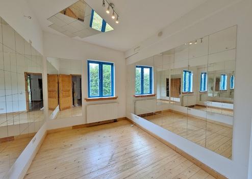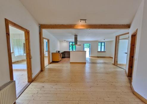 Die Betriebsleiterwohnung hat ca. 97 m² und bietet einen großzügigen Wohn-, Ess- und Kochbereich, drei Zimmer, ein Vollbad sowie einen Hauswirtschaftsraum. Der edle Holzdielenboden und ein Holzofenanschluss schaffen eine angenehme Wohnatmosphäre. Eine weitläufige Holzdielenterrasse mit Blick auf den eigenen Teich und die grüne Umgebung bietet den perfekten Rückzugsort für entspannte Pausen.