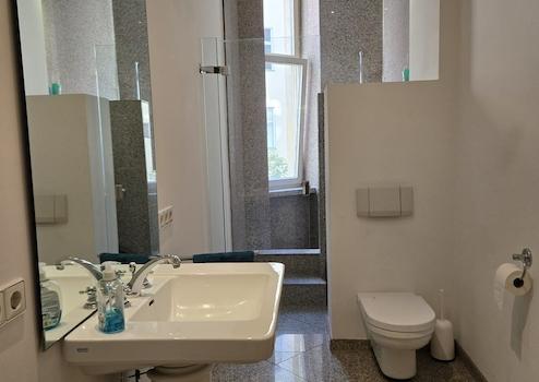 Das Badezimmer ist tagesbelichtet und verfügt über eine begehbare Dusche!