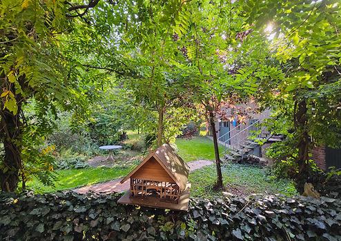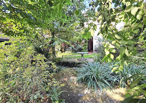 Der Garten verfügt über einen Feuerteich, dahinter liegt Ihr eigener kleiner Wald für ein naturverbundenes Familienleben.