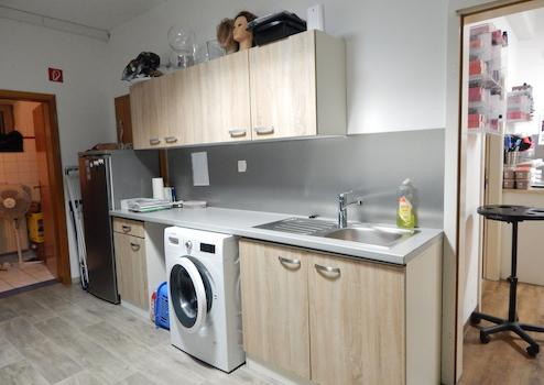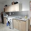 - Küche mit moderner Küchenzeile mit Waschmaschine und Trockner