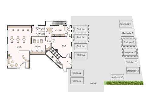 - 13 Arbeitsplätze (12 Normal, 1x Kinderplatz)
